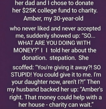 After losing my 16-year-old daughter, we chose to donate her $25,000 college fund to a local charity in her memory. But when my 30-year-old stepdaughter demanded the money—and my husband supported her—I made one condition: volunteer every Saturday for a month.