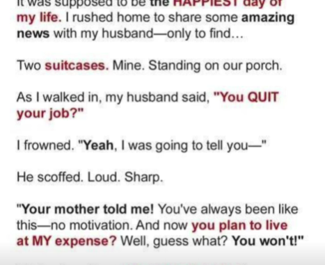 The day I quit my job was supposed to be the happiest day of my life. Instead, I came home to find my suitcases on the porch.